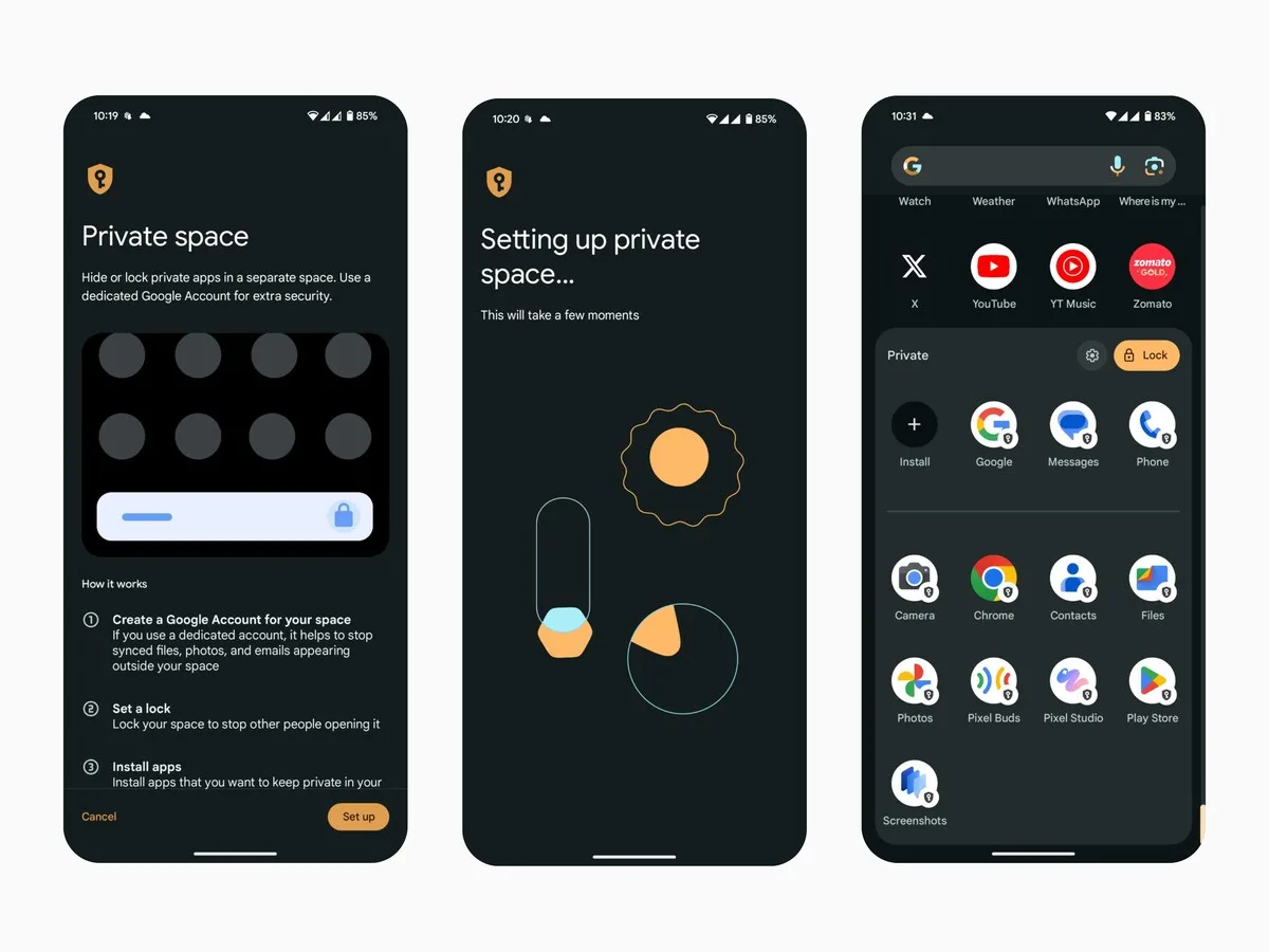 - Instalação: Você pode instalar apps pela Google Play Store dentro do Espaço Privado ou, se preferir, tocar e manter um app pressionado em “Todos os apps” e selecionar Instalar app no espaço privado.