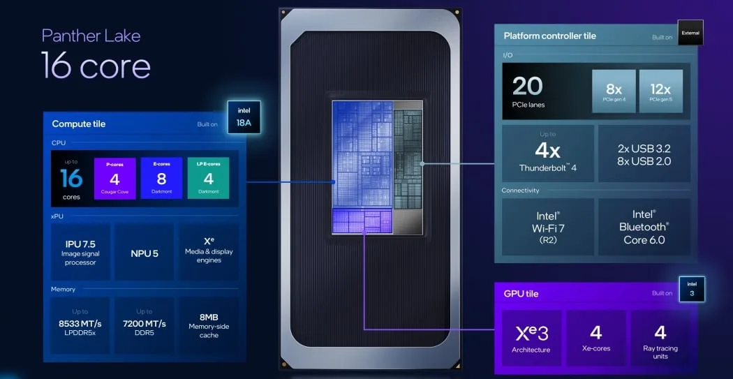 A arquitetura Panther Lake é projetada para ser escalável, utilizando um design multi-chiplet que oferece flexibilidade sem precedentes para diversos formatos, segmentos e faixas de preço. Ela promete a eficiência energética da Lunar Lake e o desempenho da Arrow Lake, combinando o melhor dos dois mundos para uma experiência de usuário superior.