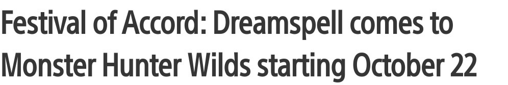 Organizado no Grand Hub, o Festival of Accord: Dreamspell transformará o ambiente com decorações festivas, refeições temáticas e gestos exclusivos. Os caçadores terão a chance de coletar bilhetes Dreamspell por tempo limitado, que podem ser trocados por conjuntos de armadura e equipamentos Palico especiais, como o Dreamwalker α Series e o Meowrionette α Series. Além disso, missões de evento temporárias e o retorno de missões passadas garantirão que sempre haja algo novo para descobrir e conquistar.